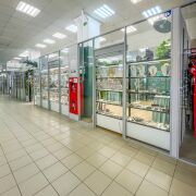 Большие витрины обеспечивают отличную видимость представленных товаров, а грамотная планировка позволяет удобно разместить как выставочные стенды, так и зону для обслуживания клиентов.