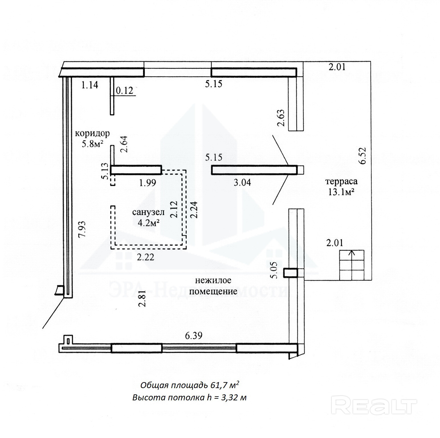 • Оптимальная площадь (61,7м2), высокий потолок (h = 3,32м), рациональная планировка (2 отдельных входа + возможность деления на 2 помещения с отдельными входами);
