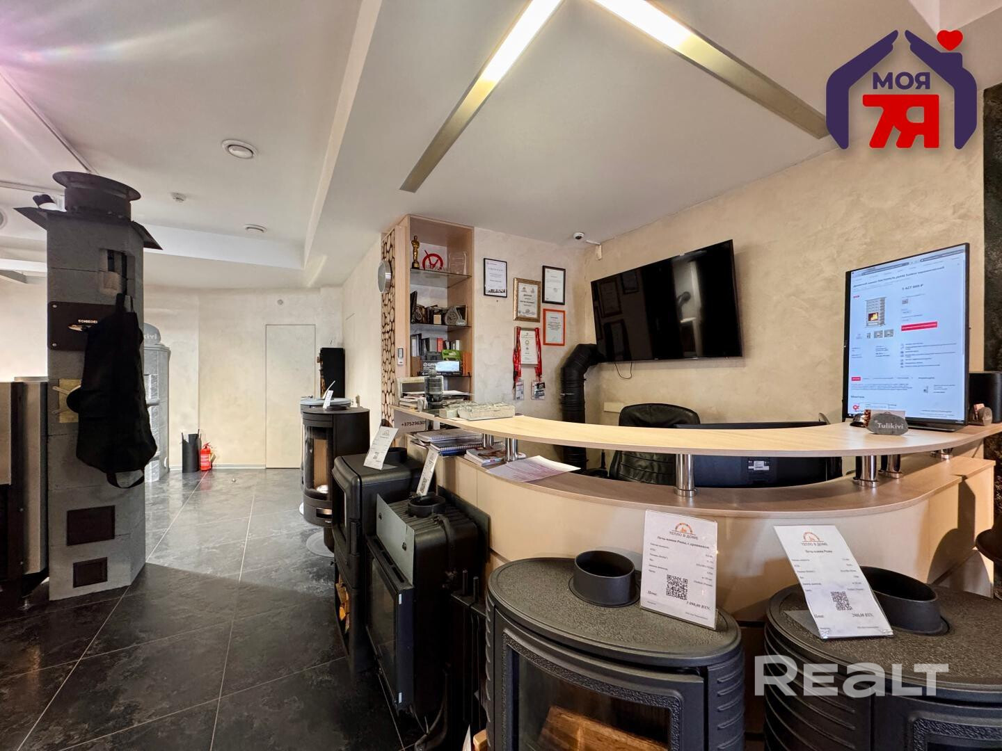 -Внутри помещение аккуратно отделано: на полу - плитка, стены окрашены, потолки оборудованы точечными светильниками, что создаёт современный и презентабельный вид.