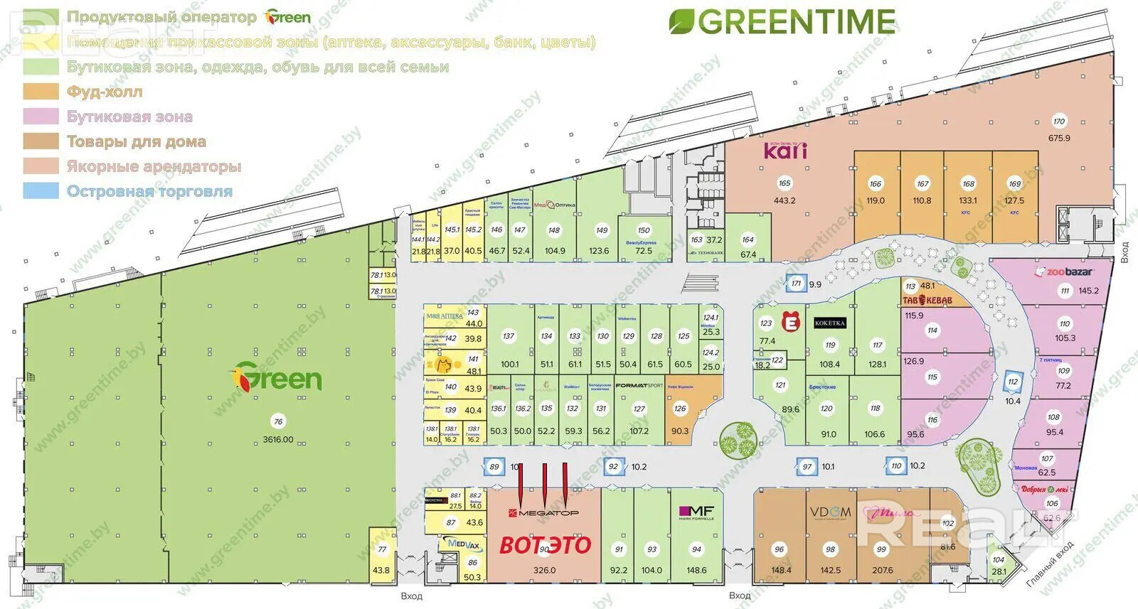 Продается торговое помещение 326.0 кв.м. с арендатором рядом с кассами в ТЦ GreenTime, по улице Рудобельская 3, г. Минск. Удачное расположение – обеспечит высокую проходимость!