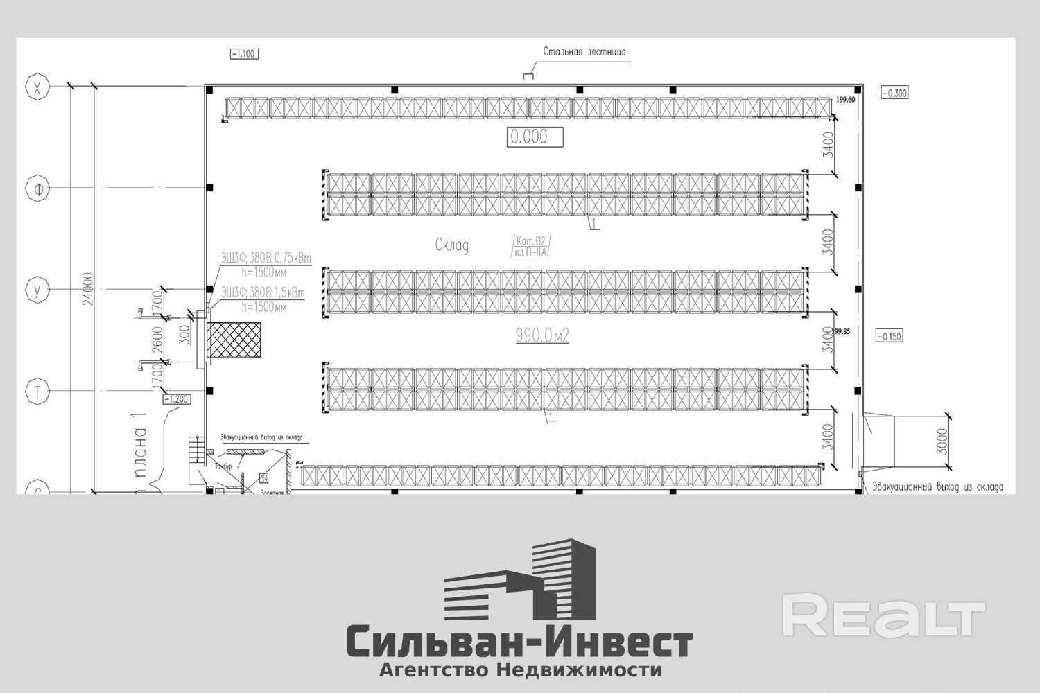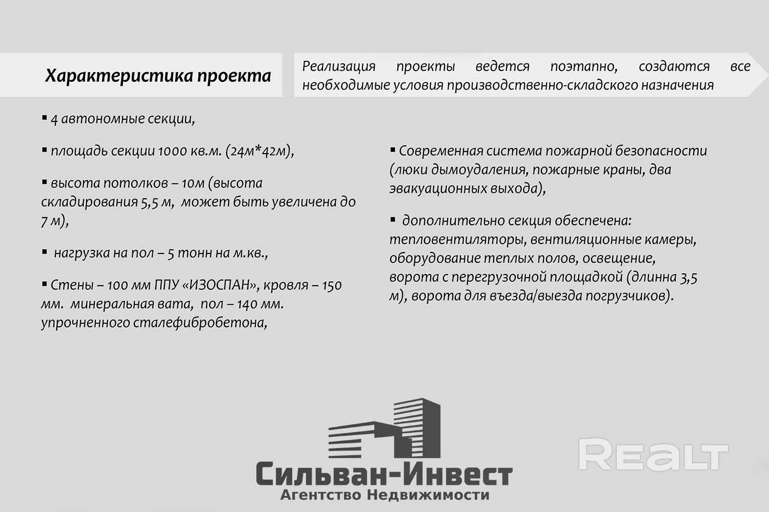 - Первый складской корпус: 4 производственно- складских секции площадью 1000 м2 (разбиты пожарными перегородками 2-го типа) + 600 м2 АКБ (в 2-х этажах)
