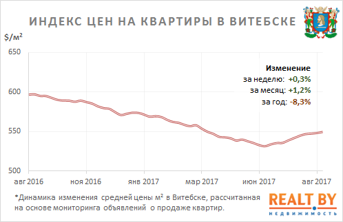 Средняя цена предложения в объявлениях о продаже квартир в Витебске на минувшей неделе выросла на 0,3% и составила 550 $/м2.