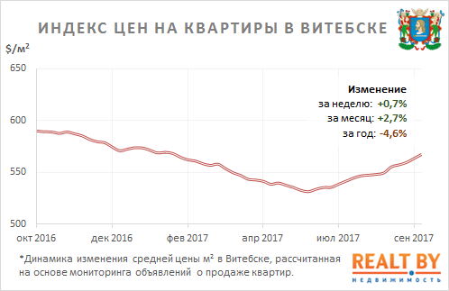 Средняя цена предложения в объявлениях о продаже квартир в Витебске на минувшей неделе выросла на 0,7% и составила 568 $/м2.