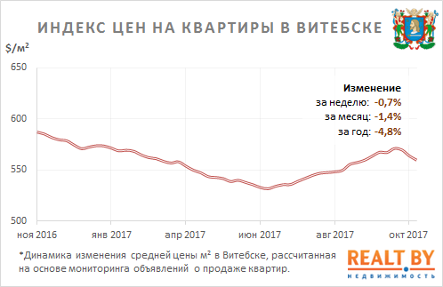 Средняя цена предложения в объявлениях о продаже квартир в Витебске на минувшей неделе снизилась на 0,7% и составила 560 $/м2.