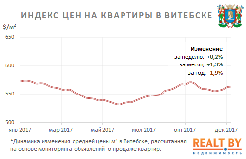 Средняя цена предложения в объявлениях о продаже квартир в Витебске на минувшей неделе выросла на 0,2% и составила 564 $/м2.