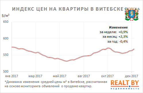 Средняя цена предложения в объявлениях о продаже квартир в Витебске на минувшей неделе выросла на 0,9% и составила 569 $/м2.