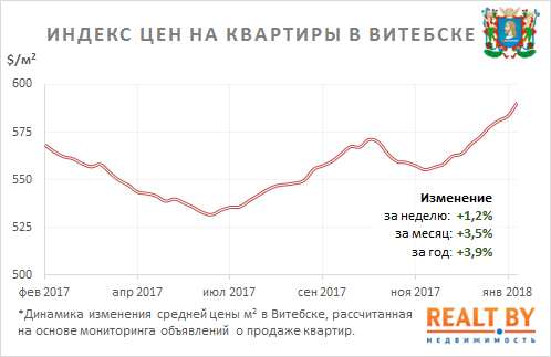 Средняя цена предложения в объявлениях о продаже квартир в Витебске на минувшей неделе выросла на 1,2% и составила 591 $/м2.
