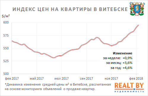 Средняя цена предложения в объявлениях о продаже квартир в Витебске на минувшей неделе выросла на 0,9% и составила 596 $/м2.