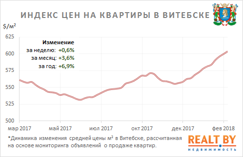Средняя цена предложения в объявлениях о продаже квартир в Витебске на минувшей неделе выросла на 0,6% и составила 604 $/м2.