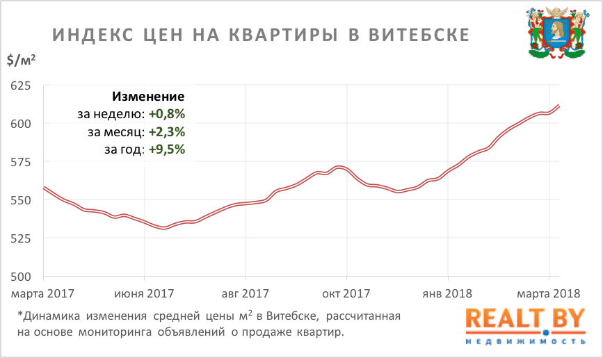 Средняя цена предложения в объявлениях о продаже квартир в Витебске на минувшей неделе выросла на 0,8% и составила 612 $/м2.