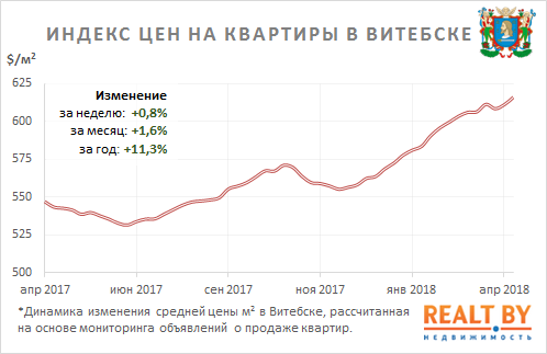 Средняя цена предложения в объявлениях о продаже квартир в Витебске на минувшей неделе выросла на 0,8% и составила 616 $/м2.