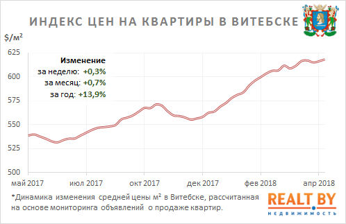 Средняя цена предложения в объявлениях о продаже квартир в Витебске на минувшей неделе выросла на 0,3% и составила 618 $/м2.