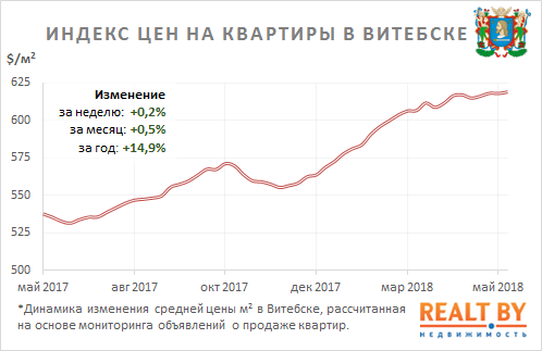 Средняя цена предложения в объявлениях о продаже квартир в Витебске на минувшей неделе выросла на 0,2% и составила 619 $/м2.