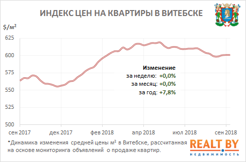 Средняя цена предложения в объявлениях о продаже квартир в Витебске на минувшей неделе не изменилась и составила 601 $/м2.