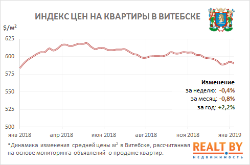 Средняя цена предложения в объявлениях о продаже квартир в Витебске на минувшей неделе снизилась на 0,4% и составила 591 $/м2.
