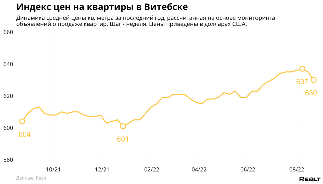 Средняя цена в объявлениях о продаже квартир в Витебске снизилась на 0.8% и составила 630 $/м2.