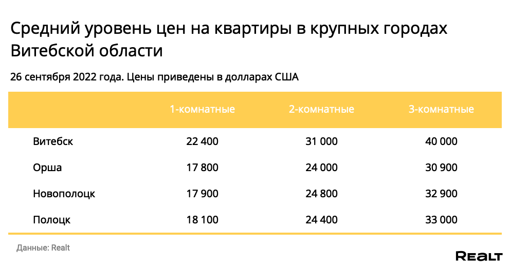 Мониторинг цен предложения квартир в Витебске и городах Витебской области за 19−26 сентября 2022 года