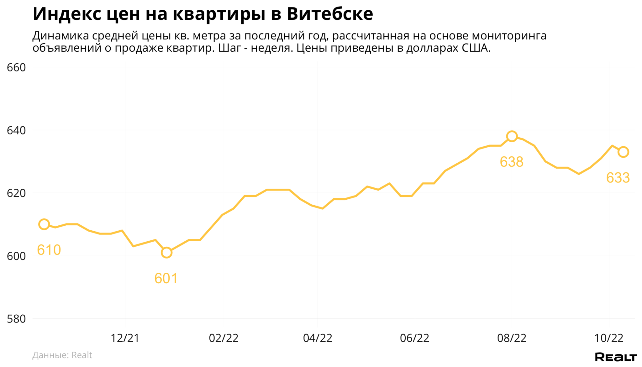 На 0.1% выросла средняя цена предложения квартир в Орше — до 501 $/м2. В Новополоцке квартиры продавались в среднем за 545 $/м2 (-0.4% за неделю). В Полоцке средняя цена квадратного метра в объявлениях о продаже квартир составила 527 $ (-0.1%).