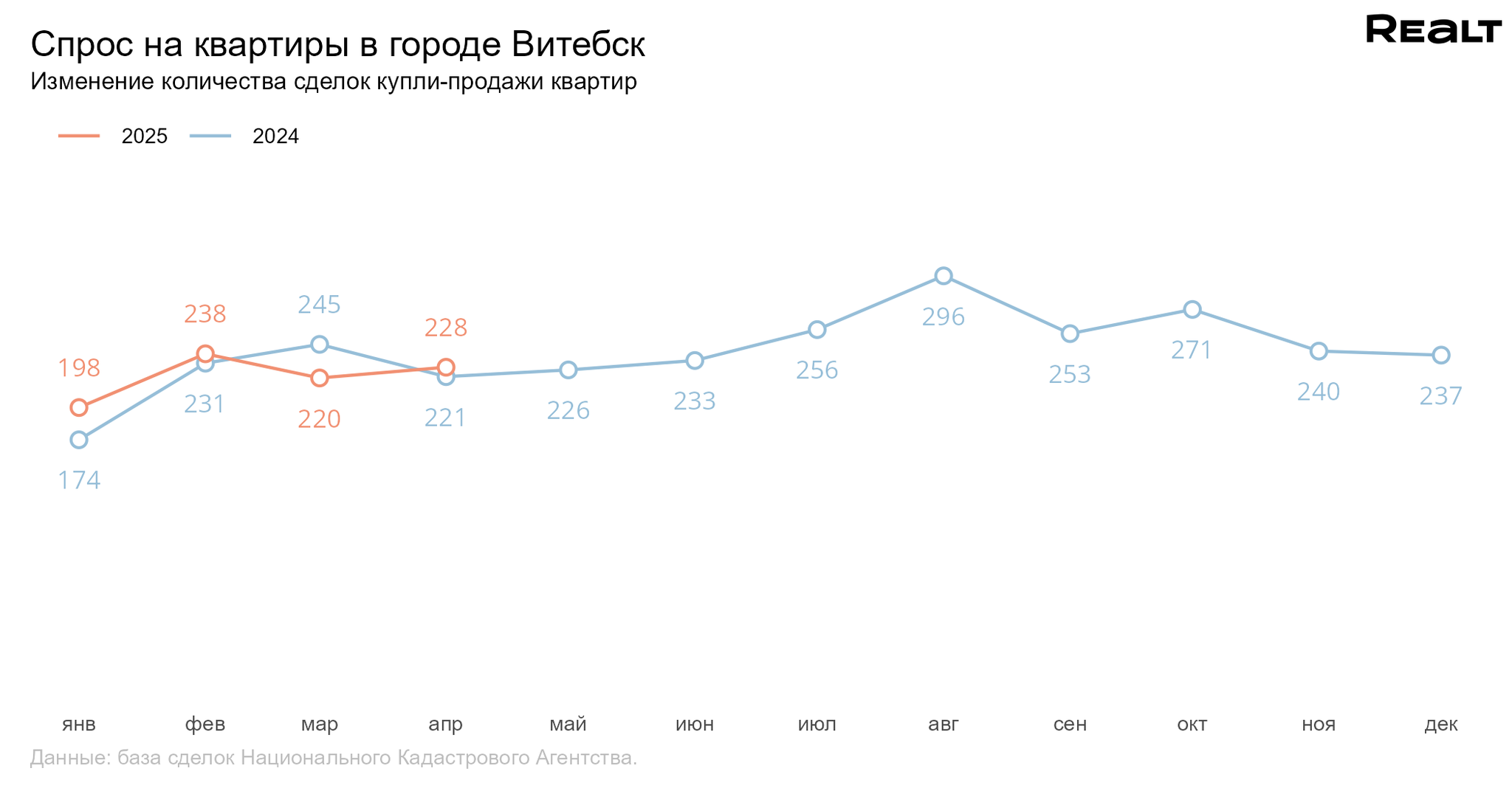 В апреле 2025 года рынок квартир в Витебске показал рост числа сделок на 3.6% по сравнению с предыдущим месяцем. В то время как предложение сократилось, средние цены на квадратные метры продолжили расти. Что еще происходит на рынке квартир Витебска — в аналитике Realt.