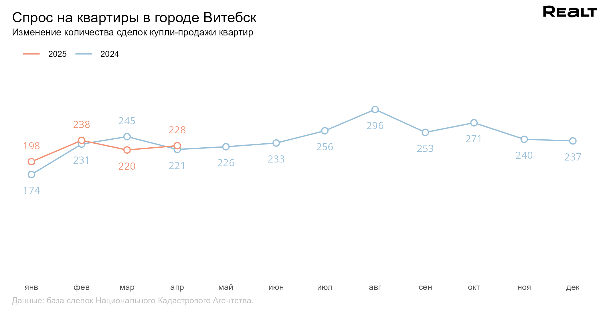 За апрель в Витебске заключили 228 сделок купли-продажи квартир. Показатели спроса текущего месяца увеличились на 3.2% по сравнению с аналогичным месяцем прошлого года.