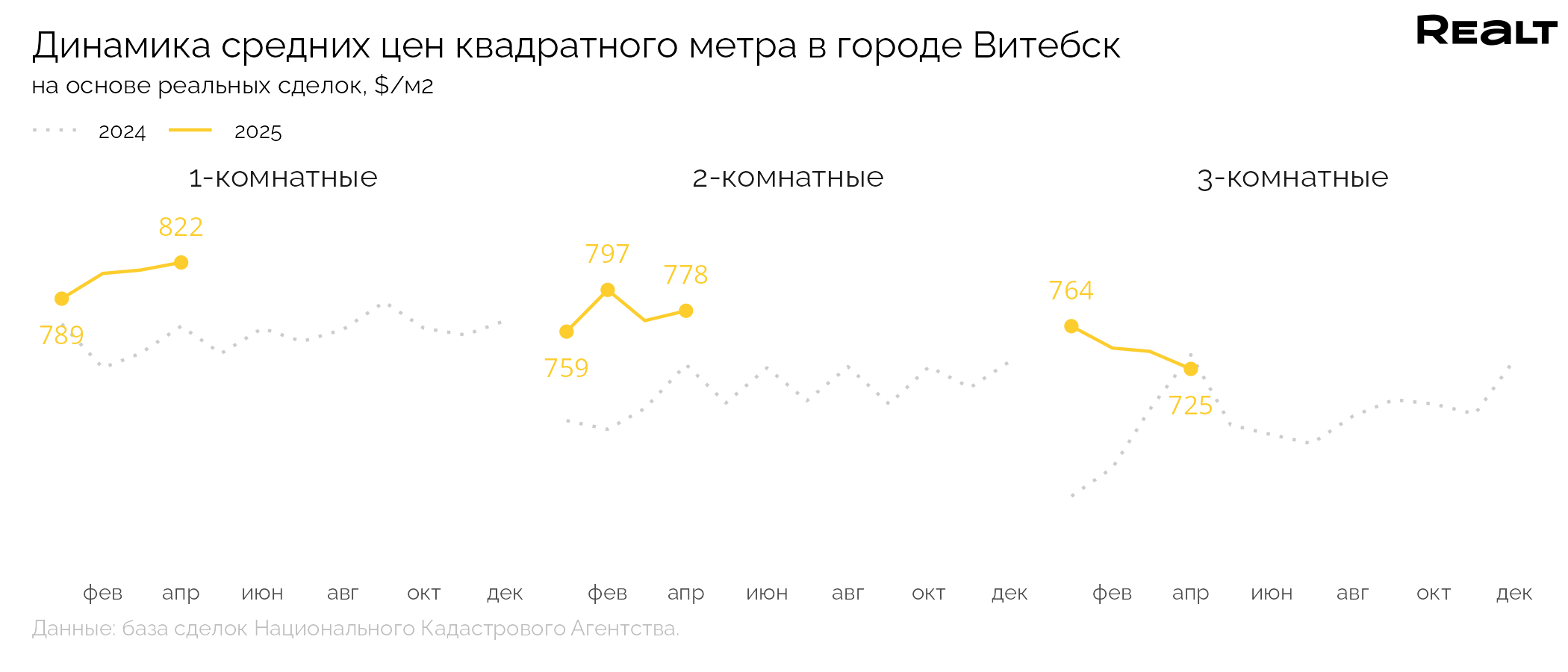 По данным сделок средняя цена квадратного метра 1-комнатных квартир, которые на данный момент продаются в среднем по 822 $/м2, увеличилась на 0.9%. Средняя стоимость 2-комнатных квартир в Витебске составляет 778 $/м2 (+1.2% за месяц). 3-комнатные квартиры продавали в среднем за 725 $/м2 (-2.2% за месяц).