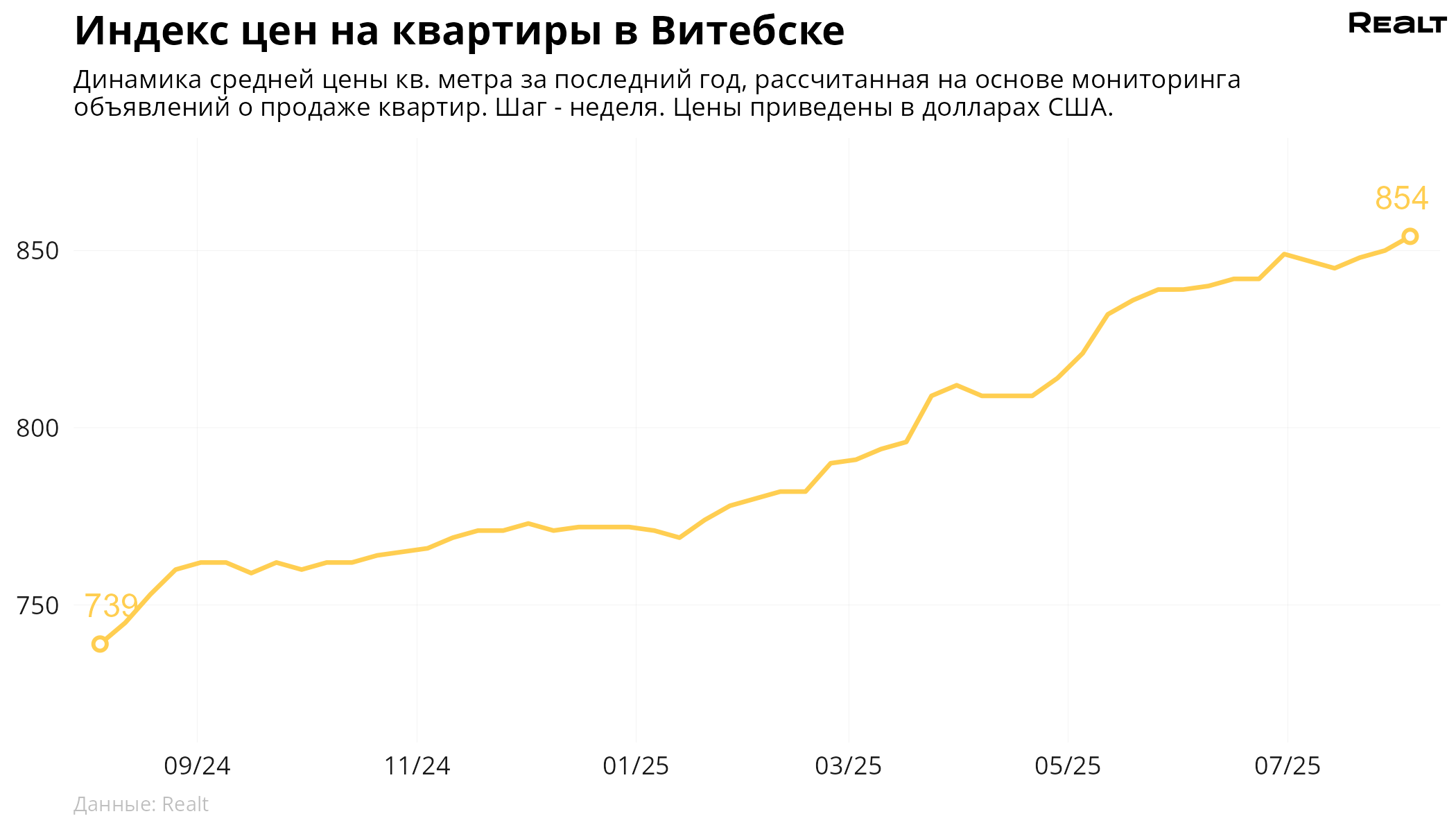 За неделю, c 28 июля по 4 августа 2025 года, средняя цена в объявлениях о продаже квартир в Витебске выросла на 0.5% и составила 854 $/м2. При этом количество квартир в продаже уменьшилось на 1%. Что еще произошло на рынке жилья крупнейших городов Витебской области за семь дней — в материале.