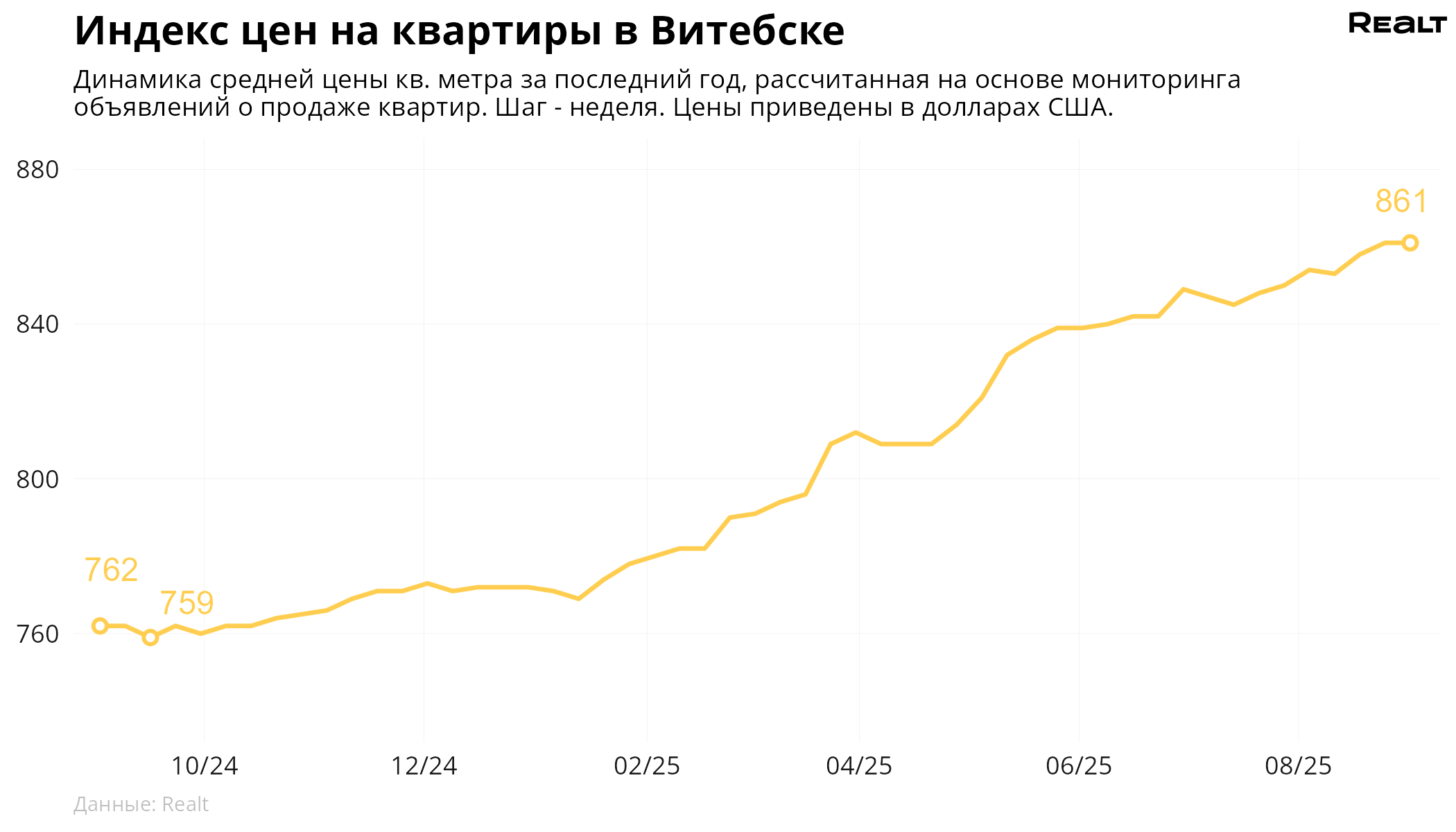 За неделю, c 25 августа по 1 сентября 2025 года, средняя цена в объявлениях о продаже квартир в Витебске не изменилась и составила 861 $/м2. При этом количество квартир в продаже не изменилось. Что еще произошло на рынке жилья крупнейших городов Витебской области за семь дней — в материале.
