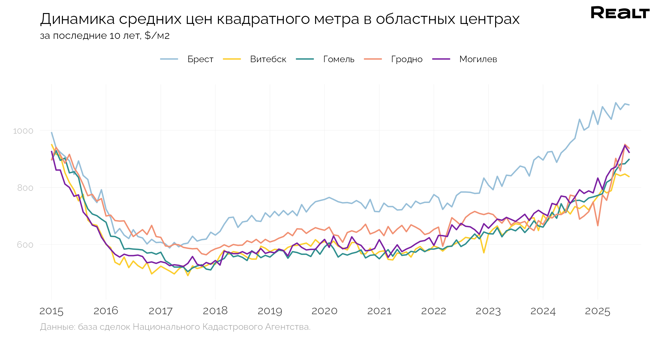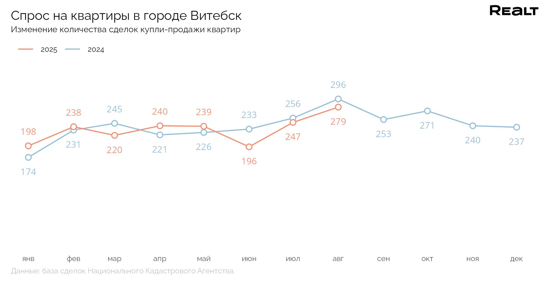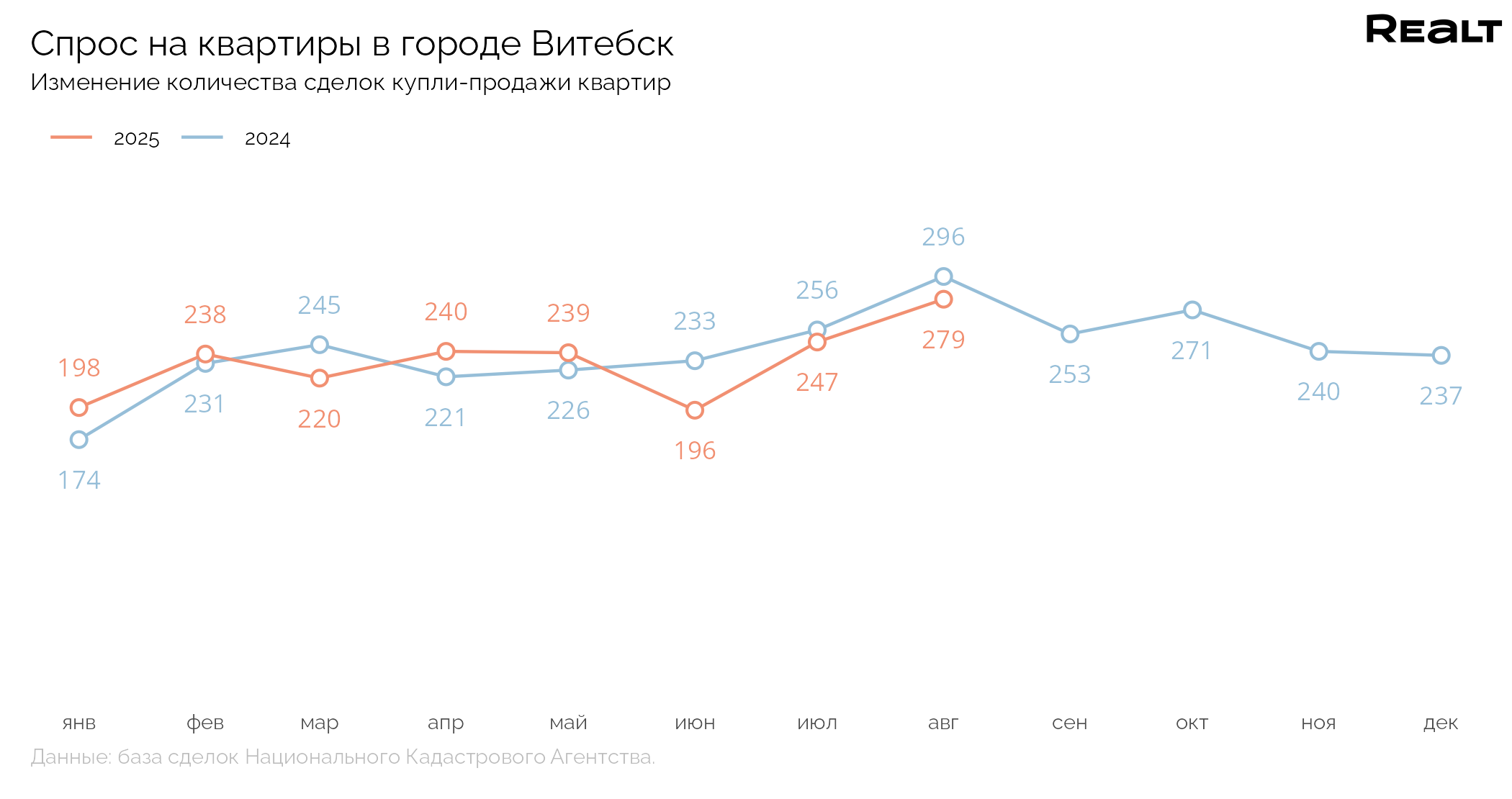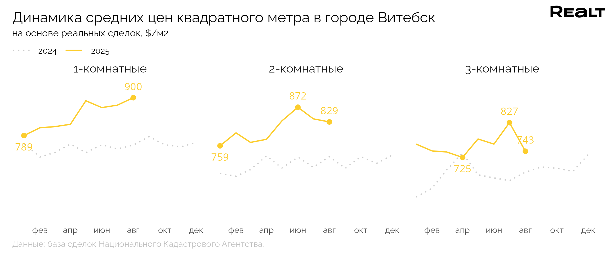Средняя цена квадратного метра квартир в Витебске в сделках за месяц снизилась на 1.2% и составила 837 $/м2. Текущий уровень цен на 14.2% выше, чем в аналогичный период прошлого года.