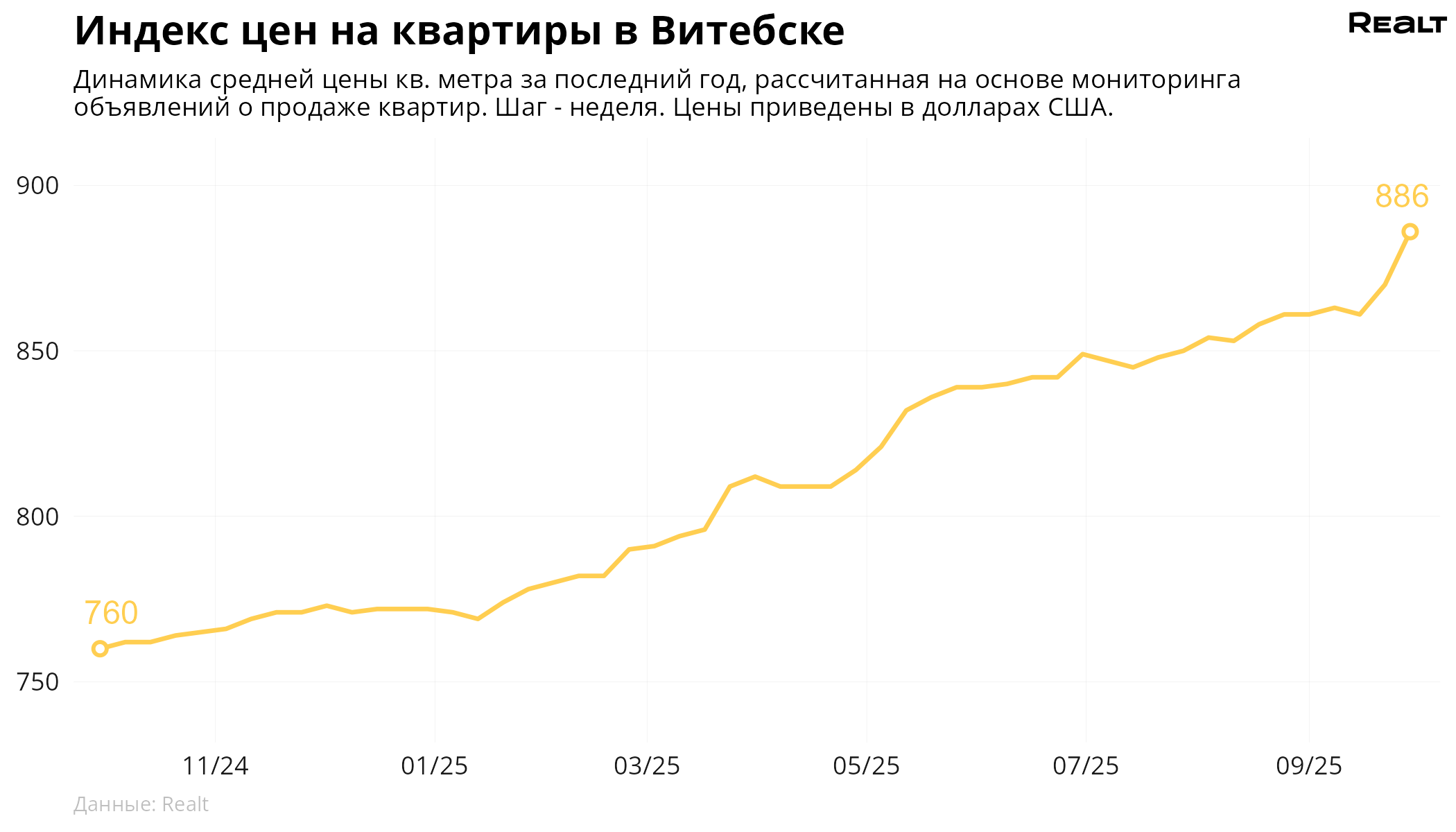 За неделю, с 22 по 29 сентября 2025 года, средняя цена в объявлениях о продаже квартир в Витебске выросла на 1.8% и составила 886 $/м2. При этом количество квартир в продаже уменьшилось на 1.5%. Что еще произошло на рынке жилья крупнейших городов Витебской области за семь дней — в материале.
