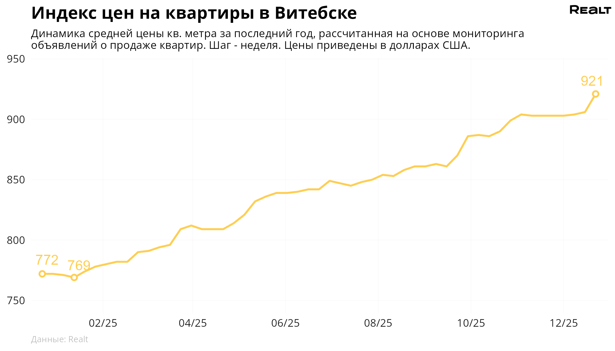 За неделю, с 15 по 22 декабря 2025 года, средняя цена в объявлениях о продаже квартир в Витебске выросла на 1.7% и составила 921 $/м2. При этом количество квартир в продаже увеличилось на 4.2%. Что еще произошло на рынке жилья крупнейших городов Витебской области за семь дней — в материале.