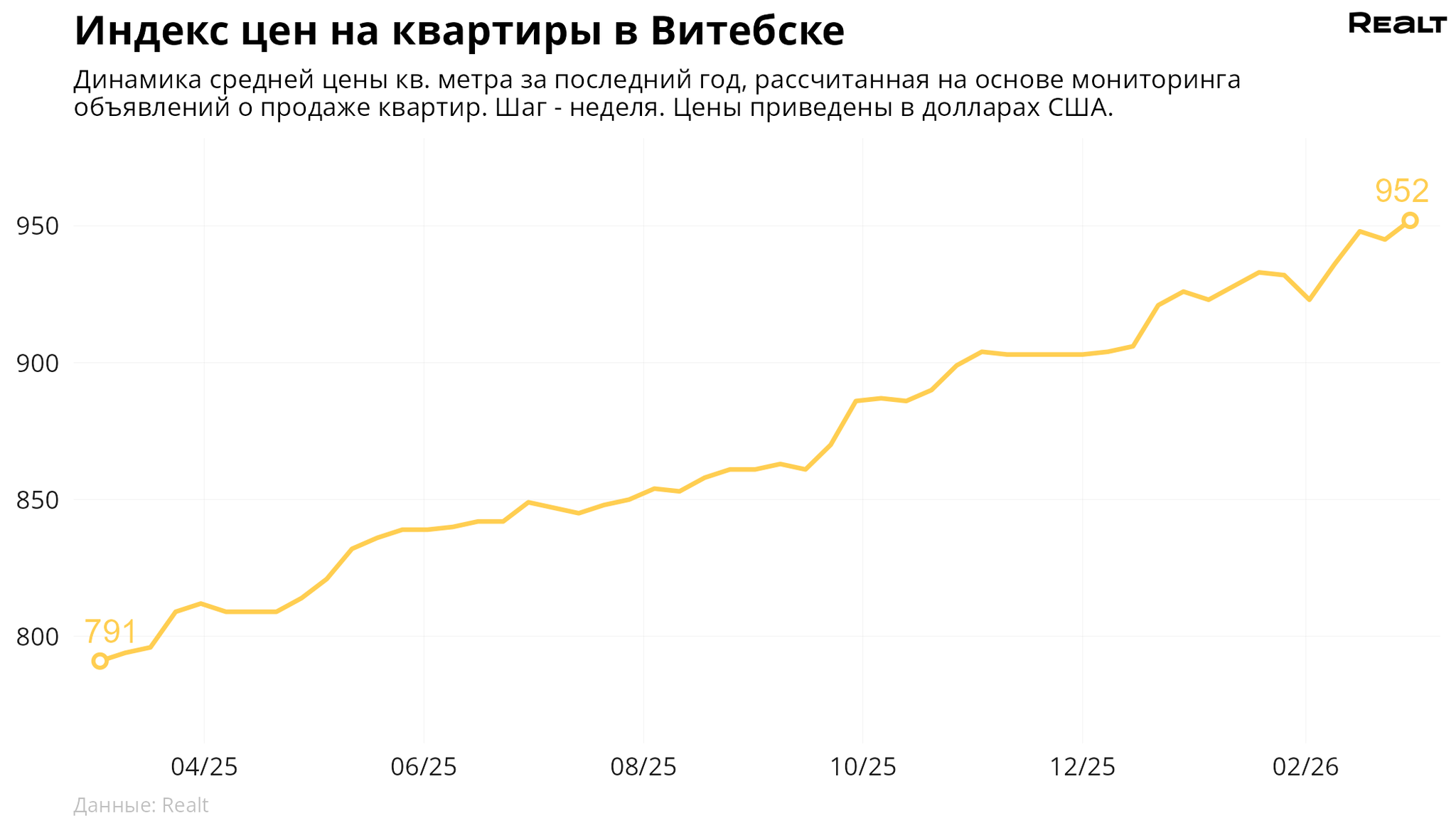 За неделю, c 23 февраля по 2 марта 2026 года, средняя цена в объявлениях о продаже квартир в Витебске выросла на 0.7% и составила 952 $/м2. При этом количество квартир в продаже увеличилось на 3%. Что еще произошло на рынке жилья крупнейших городов Витебской области за семь дней — в материале.