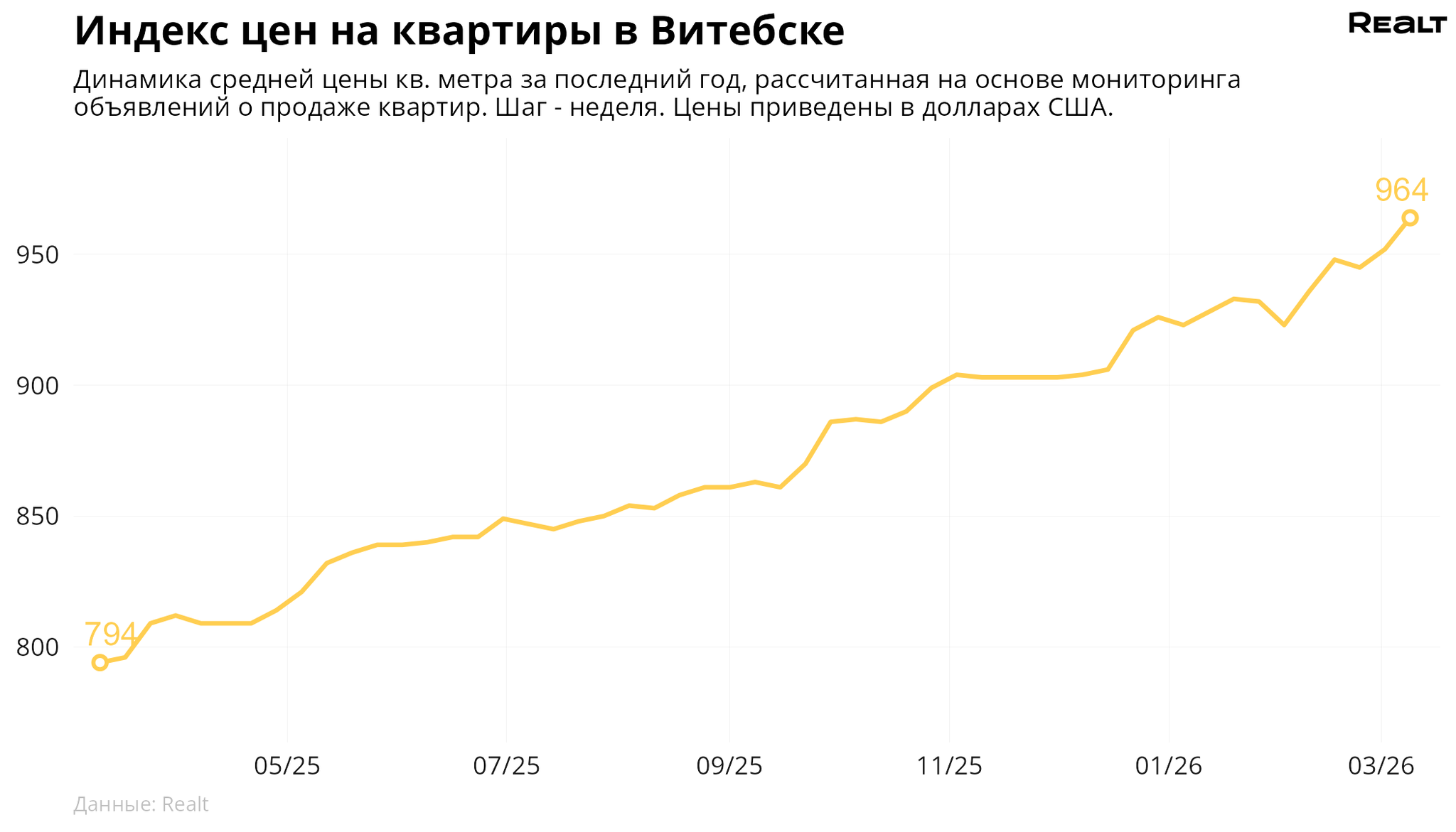 За неделю, с 2 по 9 марта 2026 года, средняя цена в объявлениях о продаже квартир в Витебске выросла на 1.3% и составила 964 $/м2. При этом количество квартир в продаже уменьшилось на 3.9%. Что еще произошло на рынке жилья крупнейших городов Витебской области за семь дней — в материале.