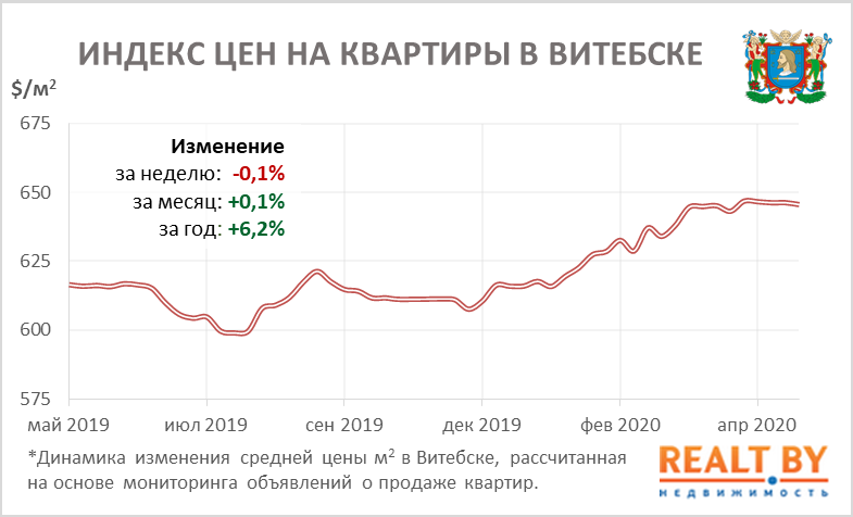 Средняя цена предложения в объявлениях о продаже квартир в Витебске на минувшей неделе снизилась на 0,1% и составила 645 $/м2.