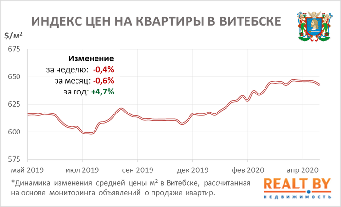 Средняя цена предложения в объявлениях о продаже квартир в Витебске на минувшей неделе снизилась на 0,4% и составила 643 $/м2.