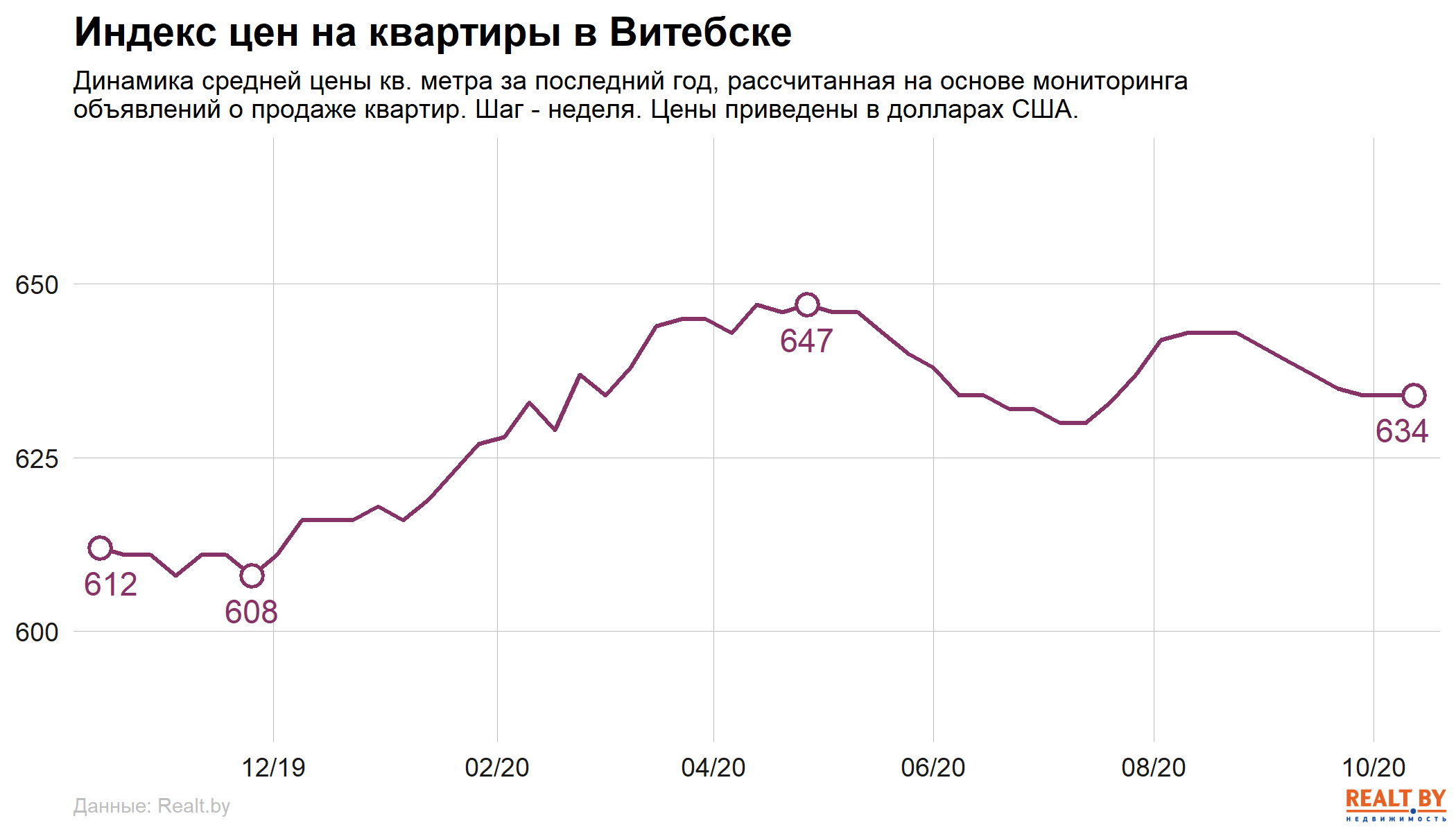 Средняя цена в объявлениях о продаже квартир в Витебске не изменилась и составила 634 $/м2.