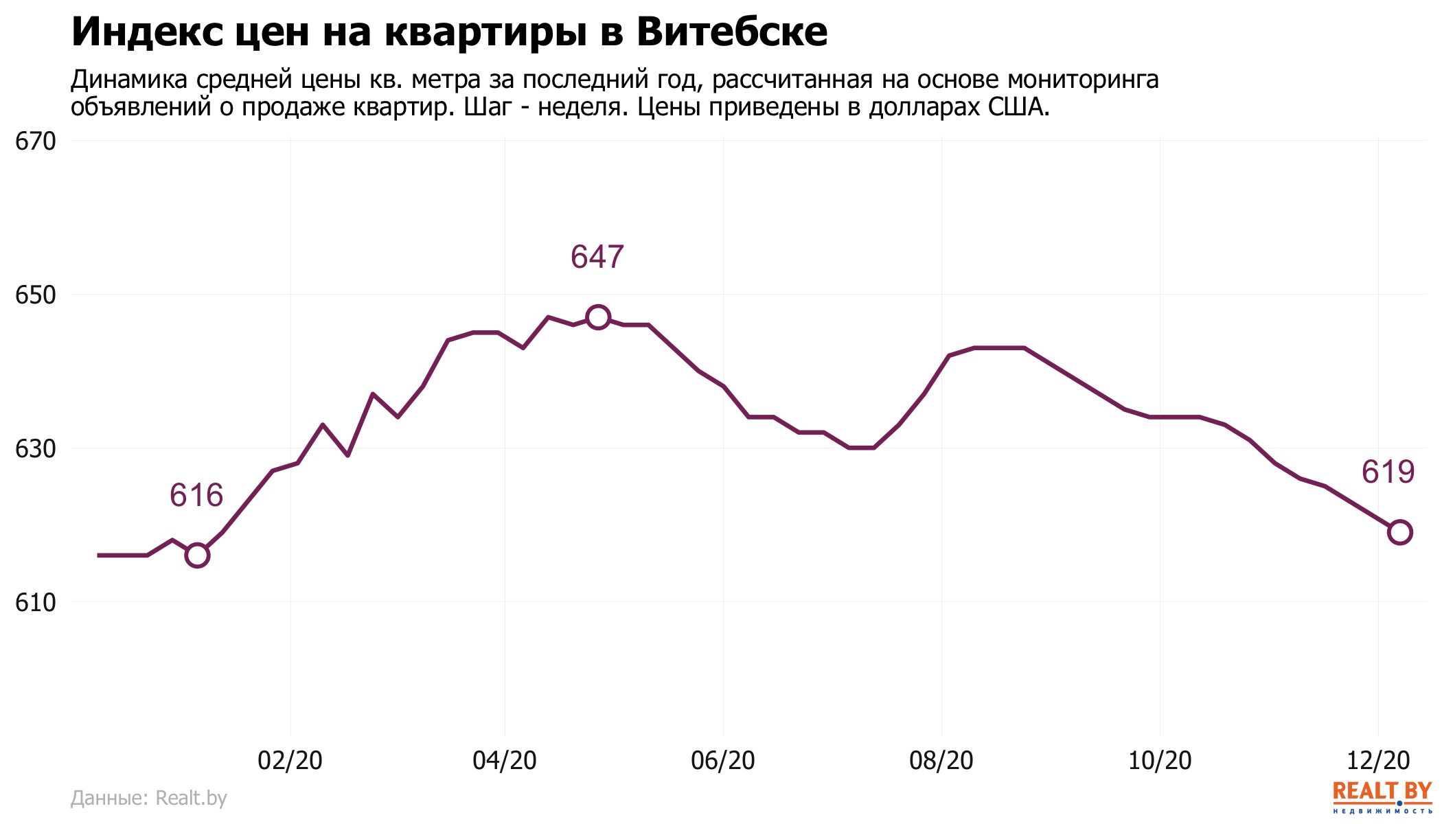 Средняя цена в объявлениях о продаже квартир в Витебске снизилась на 0.3% и составила 619 $/м2.