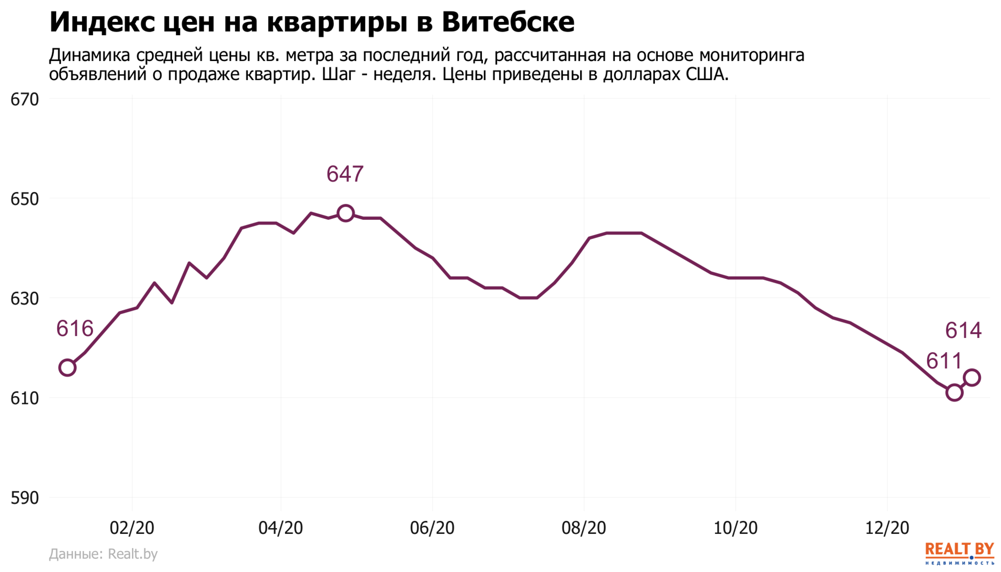 Средняя цена в объявлениях о продаже квартир в Витебске выросла на 0.5% и составила 614 $/м2.