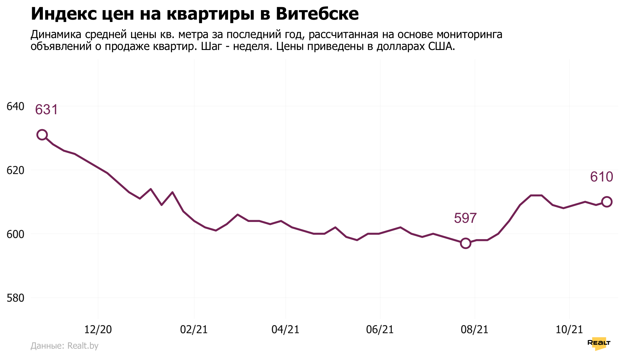 Средняя цена в объявлениях о продаже квартир в Витебске выросла на 0.2% и составила 610 $/м2.