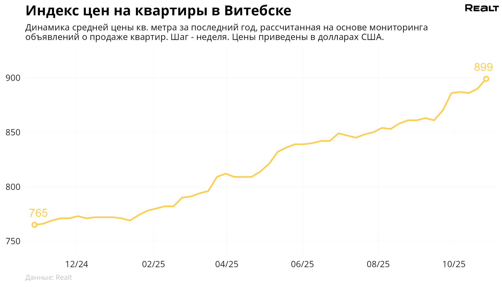 За неделю, с 20 по 27 октября 2025 года, средняя цена в объявлениях о продаже квартир в Витебске выросла на 1% и составила 899 $/м2. При этом количество квартир в продаже уменьшилось на 1%. Что еще произошло на рынке жилья крупнейших городов Витебской области за семь дней — в материале
