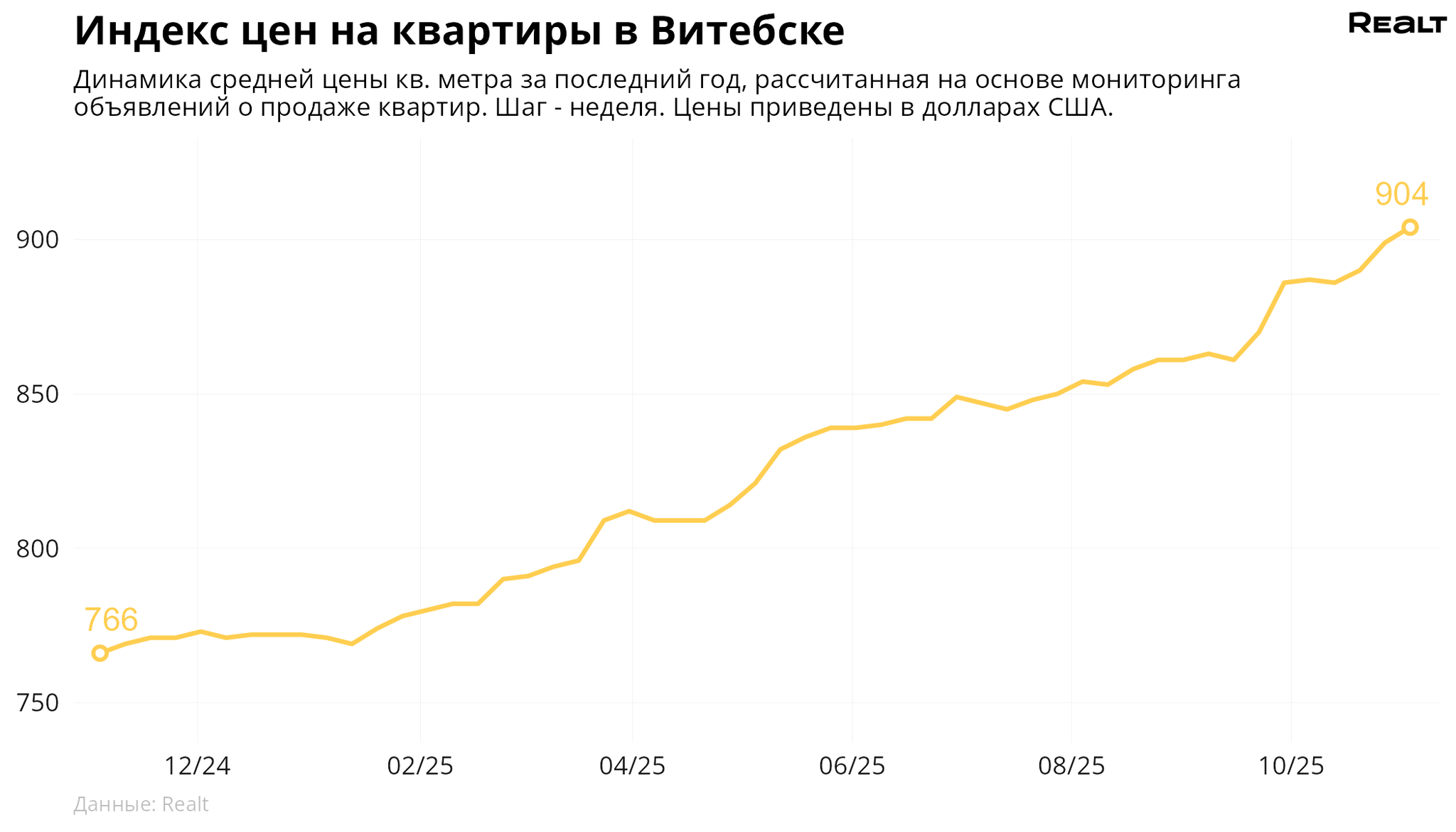 За неделю, c 27 октября по 3 ноября 2025 года, средняя цена в объявлениях о продаже квартир в Витебске выросла на 0.6% и составила 904 $/м2. При этом количество квартир в продаже уменьшилось на 1.2%. Что еще произошло на рынке жилья крупнейших городов Витебской области за семь дней — в материале.