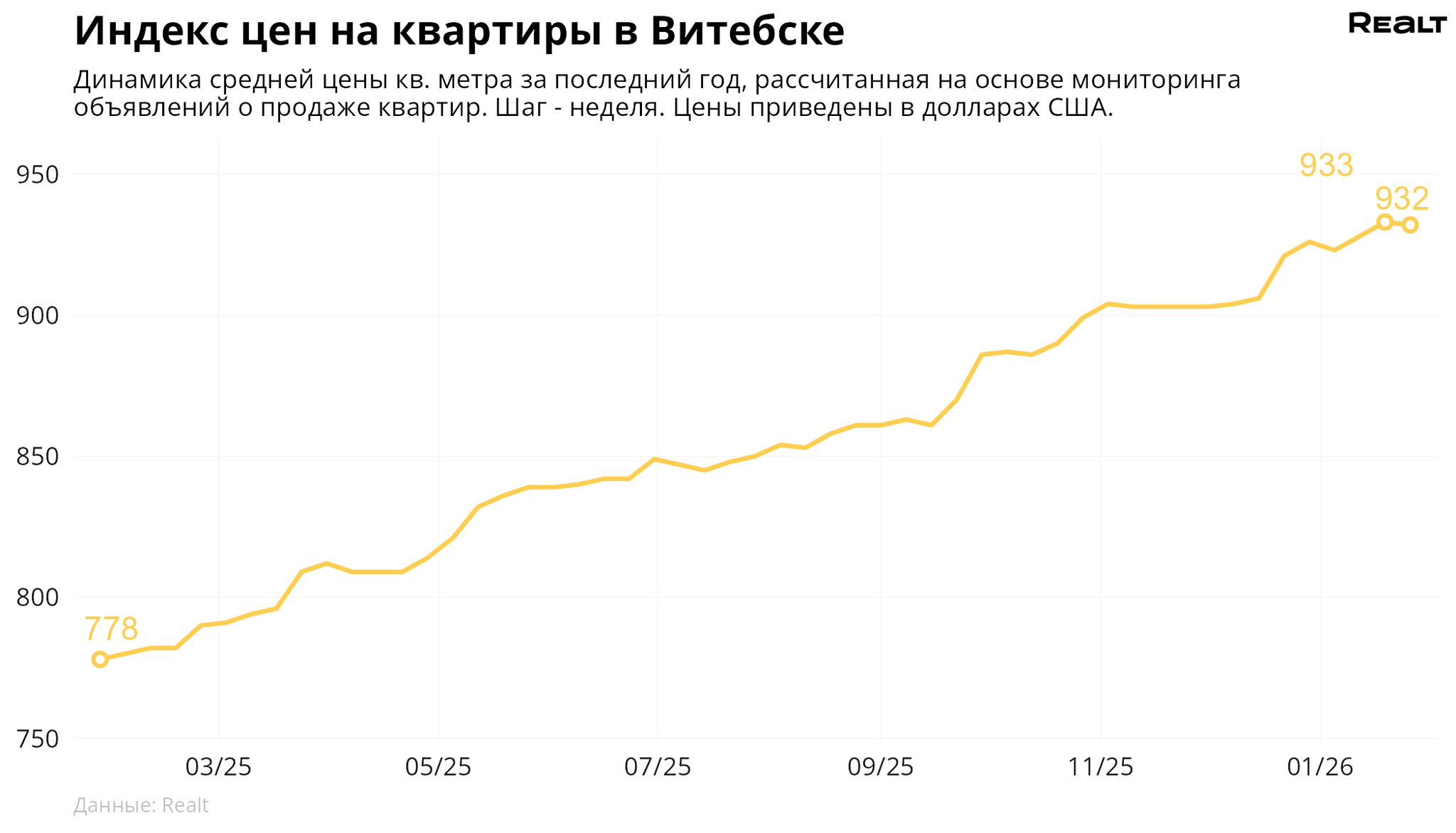 За неделю, с 19 по 26 января 2026 года, средняя цена в объявлениях о продаже квартир в Витебске снизилась на 0.1% и составила 932 $/м2. При этом количество квартир в продаже уменьшилось на 3.4%. Что еще произошло на рынке жилья крупнейших городов Витебской области за семь дней — в материале.