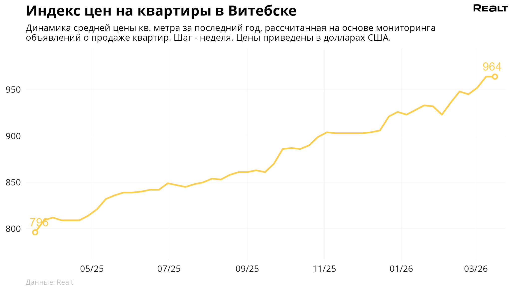 За неделю, с 9 по 16 марта 2026 года, средняя цена в объявлениях о продаже квартир в Витебске не изменилась и составила 964 $/м2. При этом количество квартир в продаже увеличилось на 2.8%. Что еще произошло на рынке жилья крупнейших городов Витебской области за семь дней — в материале.