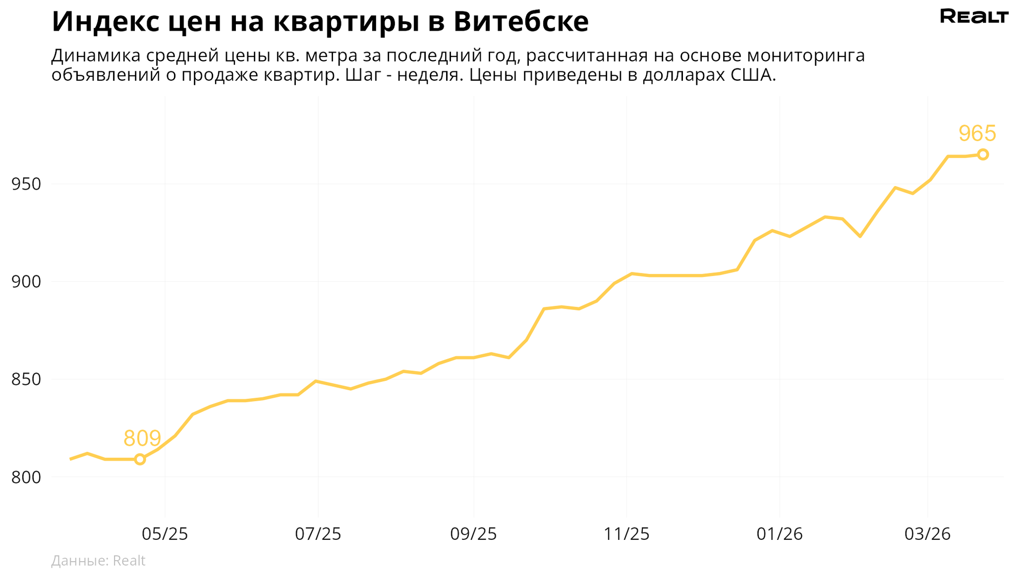 За неделю, с 16 по 23 марта 2026 года, средняя цена в объявлениях о продаже квартир в Витебске выросла на 0.1% и составила 965 $/м2. При этом количество квартир в продаже увеличилось на 0.5%. Что еще произошло на рынке жилья крупнейших городов Витебской области за семь дней — в материале.