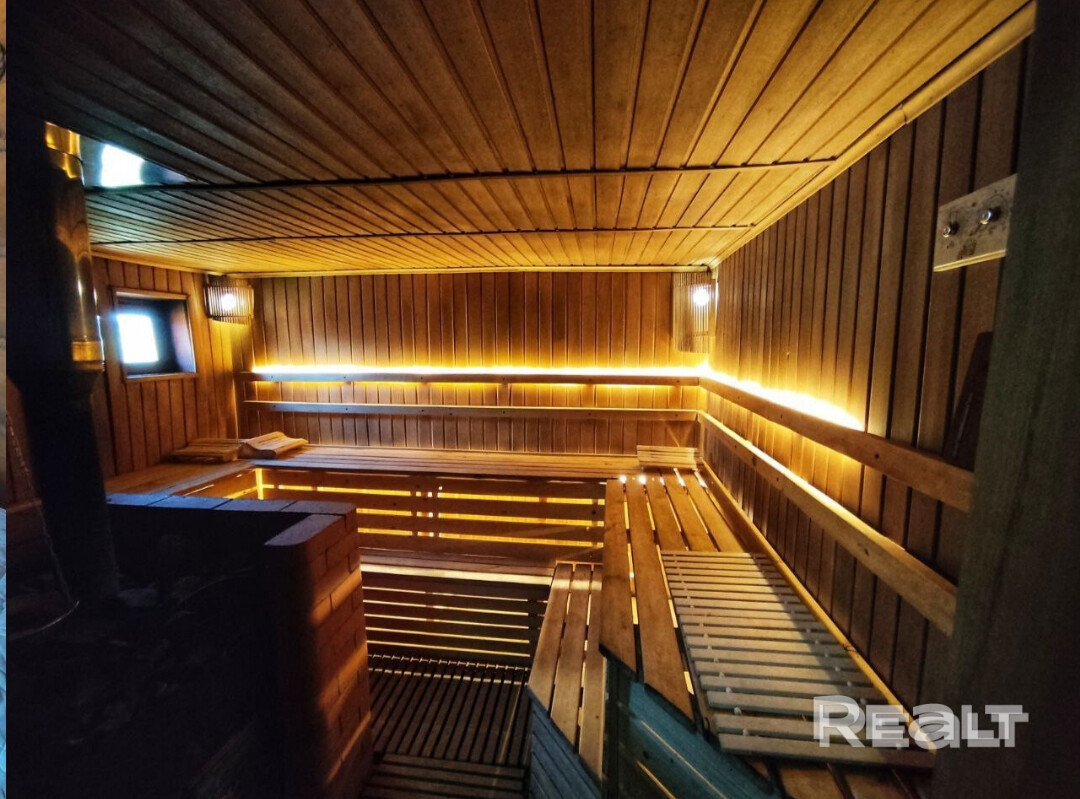 В бане большая комната отдыха (диван, стол, джакузи), санузел, душ и, конечно, парилка.