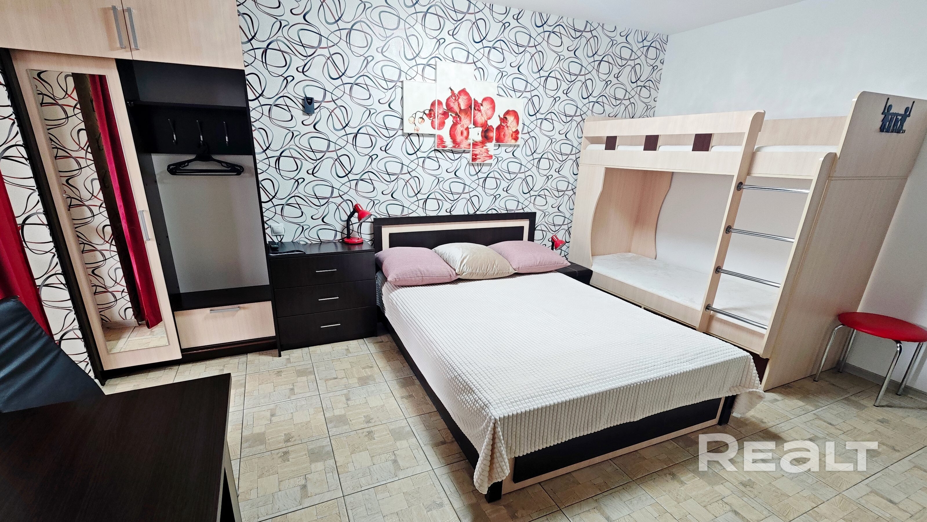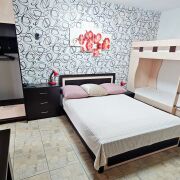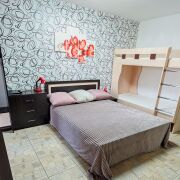 - Спальные места1 двуспальная кровать,1 двухъярусная кровать