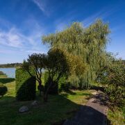 Территория в 17 соток, на которой расположены два дома, баня, теплица, плодовые и декоративные деревья. Спуск в озеро прямо с территории участка!