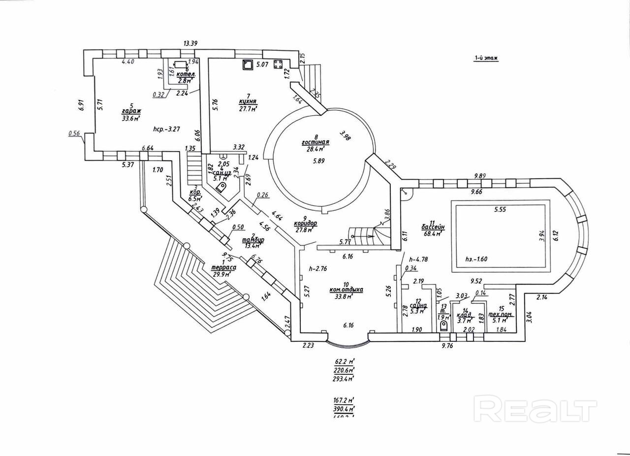 Жилая площадь составляет 167 кв.м., в нее входит 3 больших спальни на втором этаже, где в двух имеются собственные гардеробные. Есть огромная кухня 27.7 кв.м., гараж на 2 машины, бассейн 68 кв.м., сауна, комната отдыха 34 кв.м.