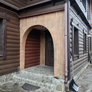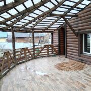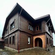 - Фасад утеплён минеральной плитой (100 мм) и обшит декоративным деревянным брусом, что обеспечивает не только красивый внешний вид, но и энергоэффективность.