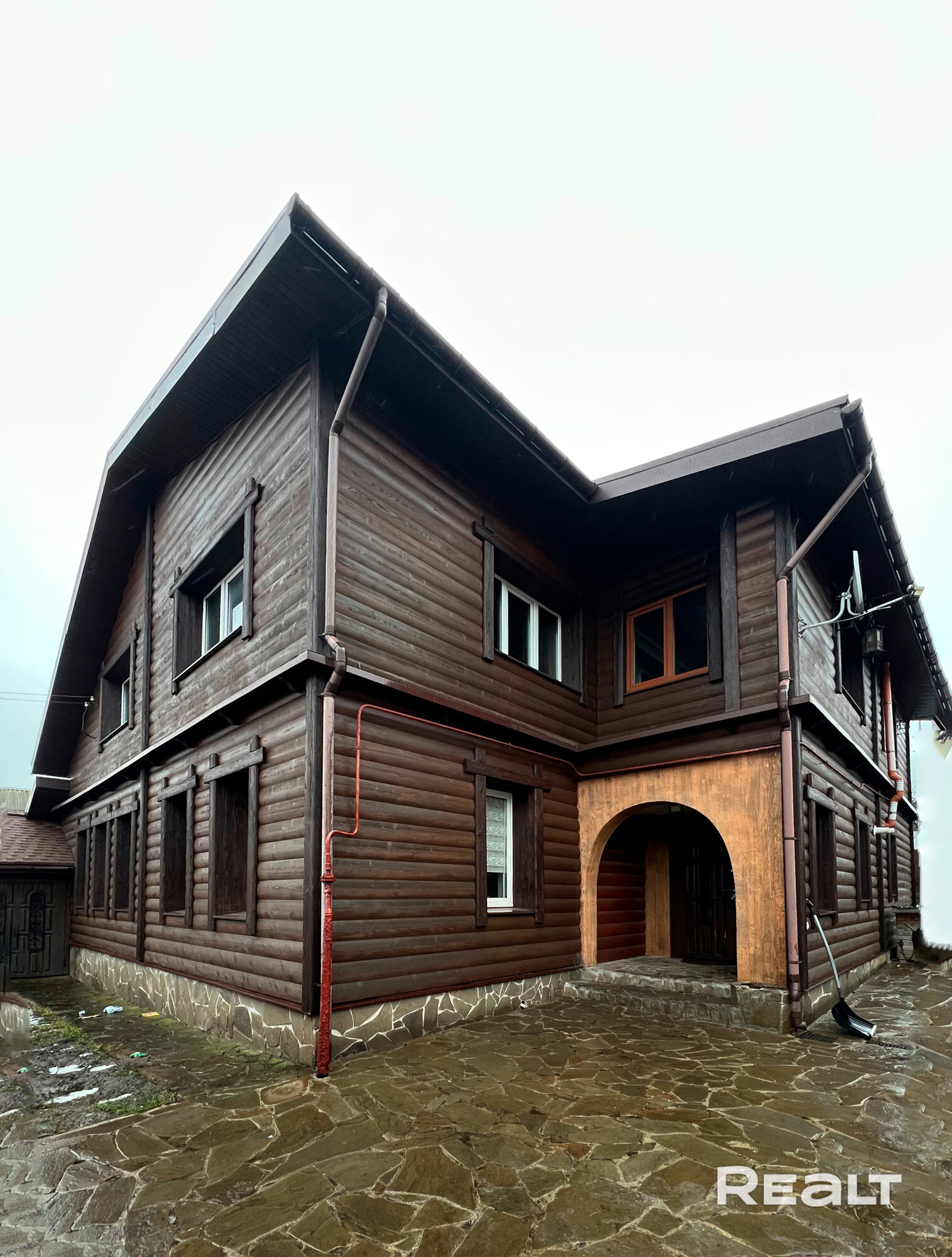 - Дом сочетает в себе современный комфорт и натуральные материалы: деревянный брус, каменная беседка, мягкая черепица. Это создаёт атмосферу уюта и гармонии с природой.