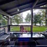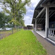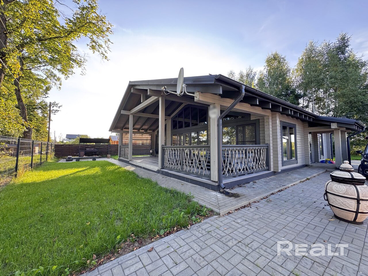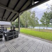 Участок спланирован, тротуарная плитка, гараж, баня. Просторная терраса с шикарным видом на водную систему.